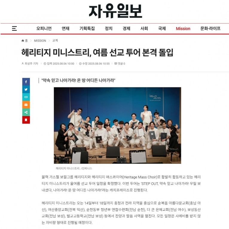 [기사] 헤리티지 미니스트리, 여름 선교 투어 본격 돌입(자유일보)
