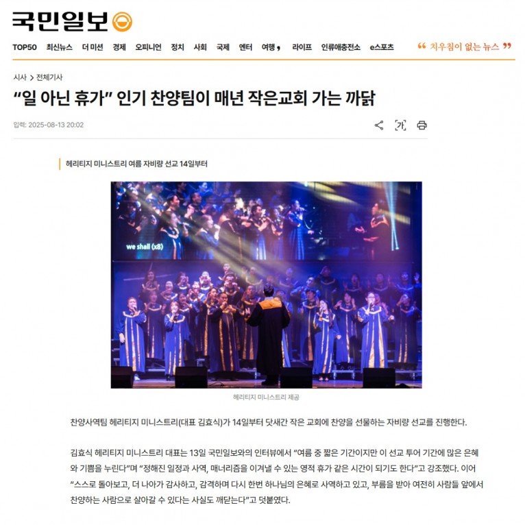 [기사] “일 아닌 휴가” 인기 찬양팀이 매년 작은교회 가는 까닭(국민일보)