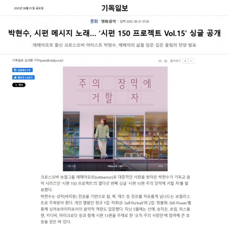 [기사] 박현수, 시편 메시지 노래… ‘시편 150 프로젝트 Vol.15’ 싱글 공개(기독일보)
