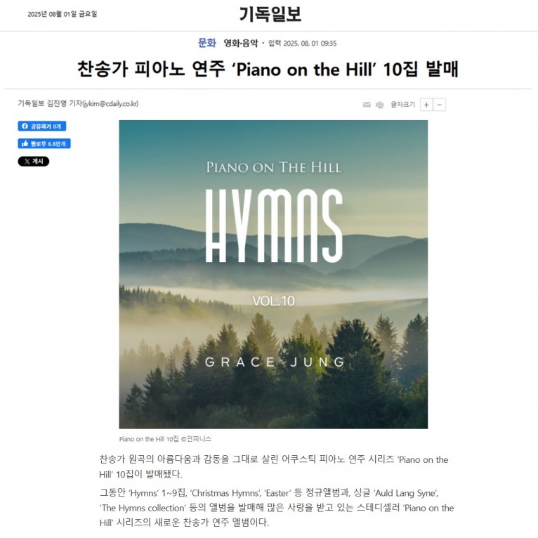뮤직타임 [기사] 찬송가 피아노 연주 ‘Piano on the Hill’ 10집 발매(기독일보)