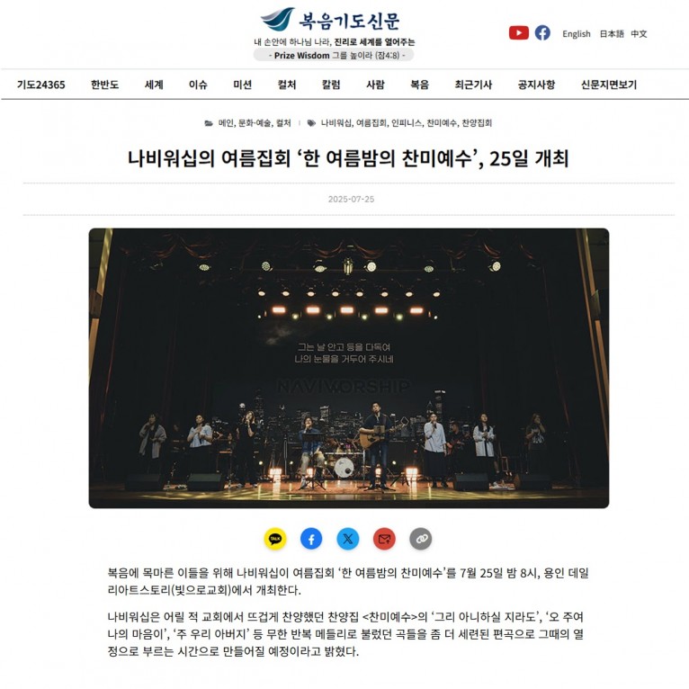 [기사] 나비워십의 여름집회 ‘한 여름밤의 찬미예수’, 25일 개최(복음기도신문)