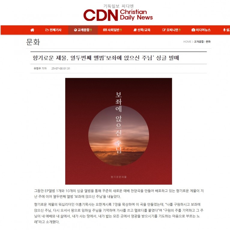 뮤직타임 [기사] 향기로운 제물, 열두번째 앨범 ‘보좌에 앉으신 주님’ 싱글 발매(기독일보 씨디엔)