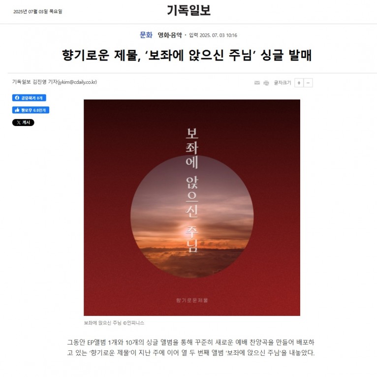 뮤직타임 [기사] 향기로운 제물, ‘보좌에 앉으신 주님’ 싱글 발매(기독일보)