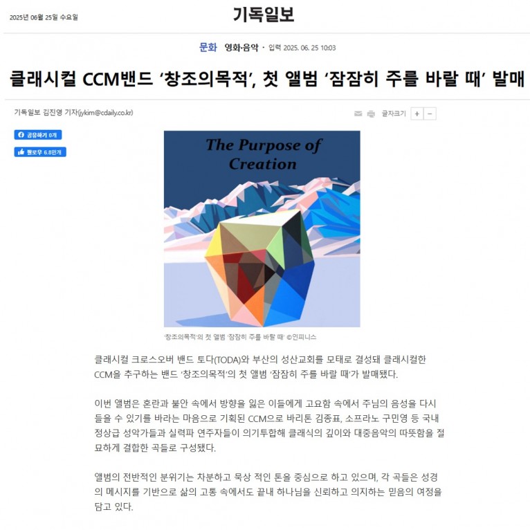 클래시컬 크로스오버 밴드 토다(TODA)와 부산의 성산교회를 모태로 결성돼 클래시컬한 CCM을 추구하는 밴드 ‘창조의목적’의 첫 앨범 ‘잠잠히 주를 바랄 때’가 발매됐다.
