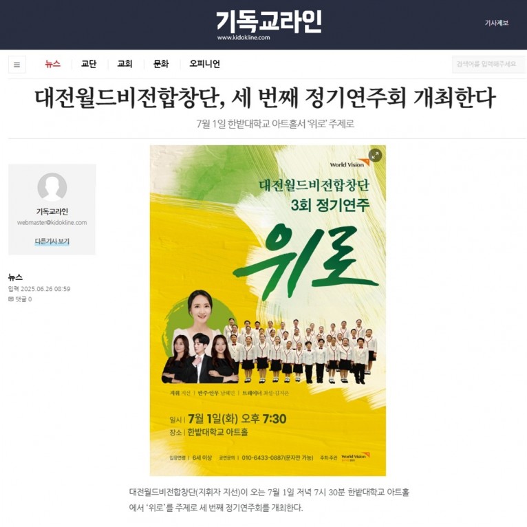 뮤직타임 [기사] 대전월드비전합창단, 세 번째 정기연주회 개최한다(기독교라인 대백신문)