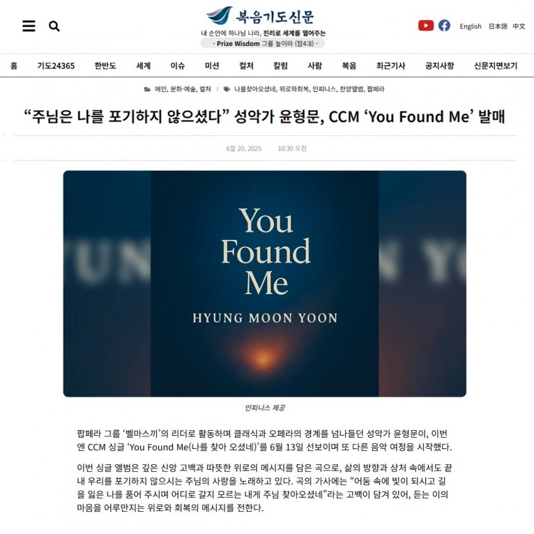 뮤직타임 [기사] “주님은 나를 포기하지 않으셨다” 성악가 윤형문, CCM ‘You Found Me’ 발매(복음기도신문)