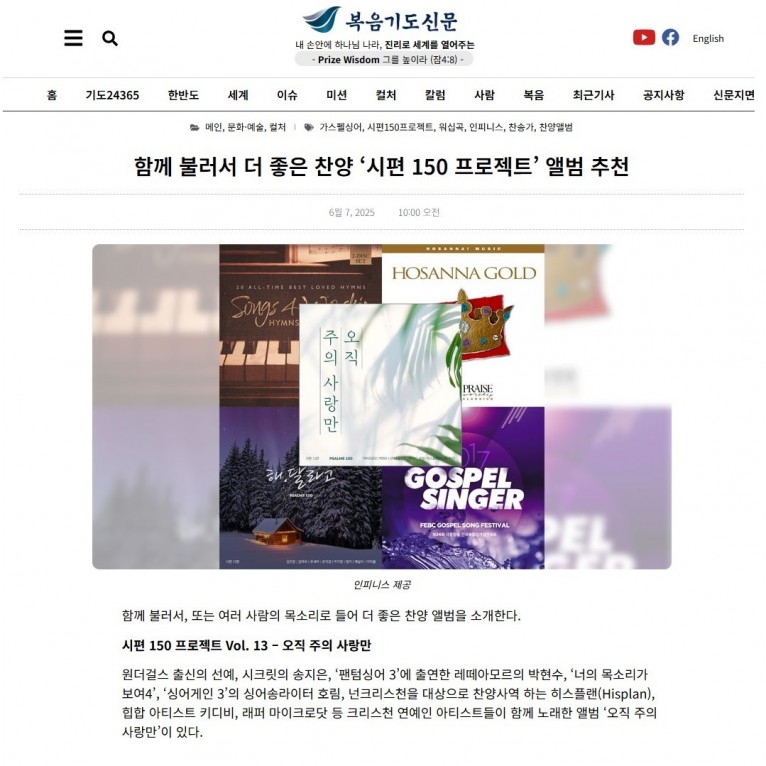 뮤직타임 [기획기사] 함께 불러서 더 좋은 찬양 ‘시편 150 프로젝트’ 앨범 추천(복음기도신문)