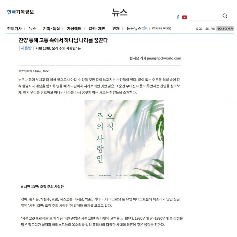 [기사] 찬양 통해 고통 속에서 하나님 나라를 꿈꾼다 ‘시편 13편 오직 주의 사랑만’(한국기독공보)
