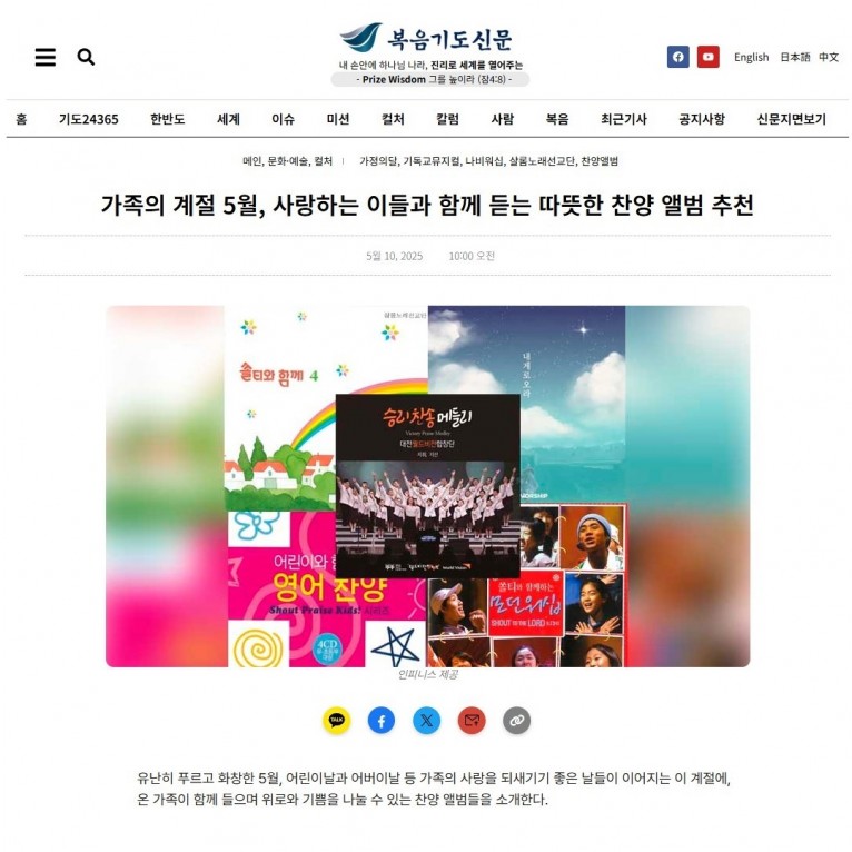 뮤직타임 [기획기사] 가족의 계절 5월, 사랑하는 이들과 함께 듣는 따뜻한 찬양 앨범 추천(복음기도신문)