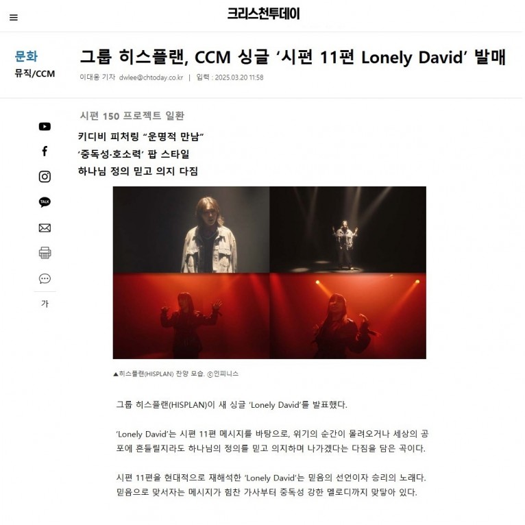 뮤직타임 [기사] 그룹 히스플랜, CCM 싱글 ‘시편 11편 Lonely David’ 발매(크리스천투데이)