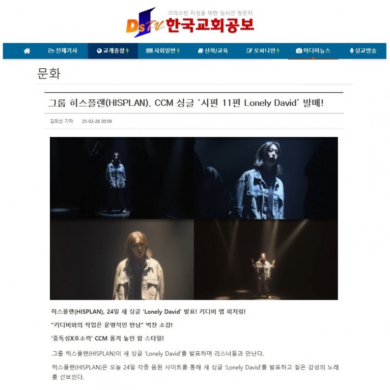 [기사] 그룹 히스플랜(HISPLAN), CCM 싱글 ‘시편 11편 Lonely David’ 발매!(한국교회공보)