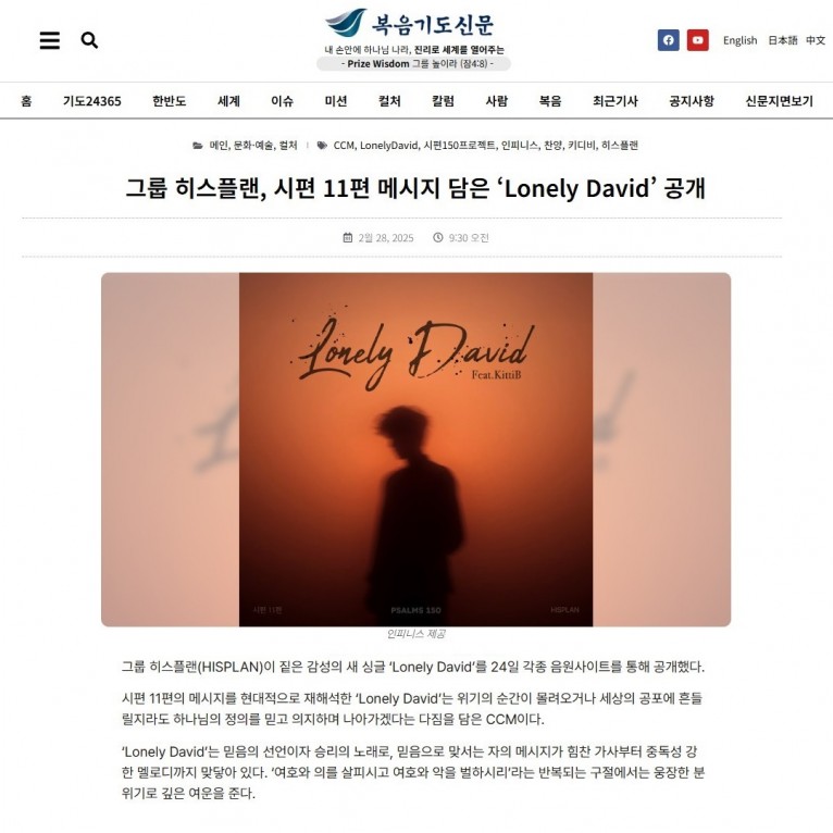 [기사] 그룹 히스플랜, 시편 11편 메시지 담은 ‘Lonely David’ 공개(복음기도신문)