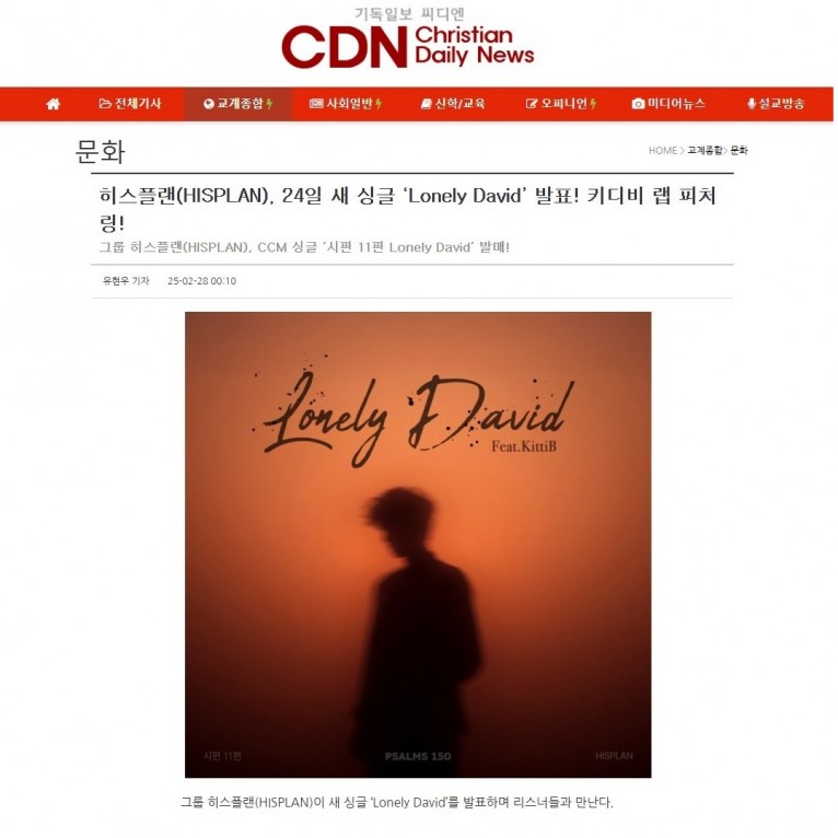 새 싱글 ‘Lonely David’를 노래한 히스플랜(HISPLAN)은 기독교인이 아닌 사람들을 위해 만든 찬양사역팀으로, 찬양을 편곡해서 뮤직비디오로 만드는 형식으로 활동하고 있다. 최근에는 ‘2024 K-CCM 어워즈’에서 ‘Need you, Lord!’로 CCM 부문에서 수상했을 정도로 탁월한 음악 실력을 인정받고 있다.