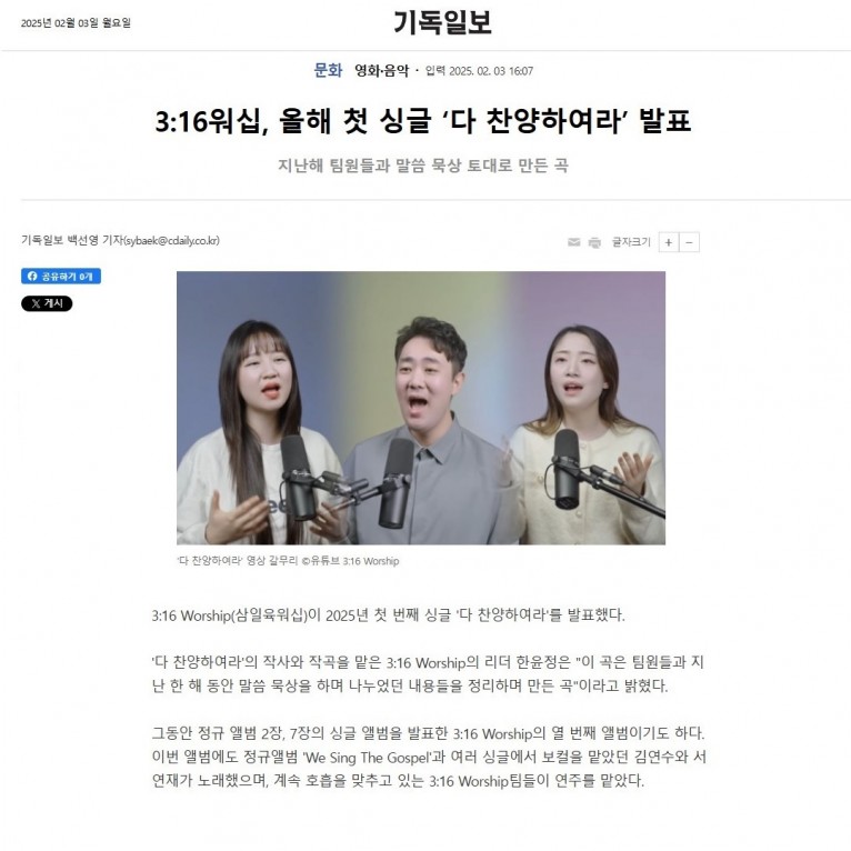 [기사] 3:16워십, 올해 첫 싱글 ‘다 찬양하여라’ 발표(기독일보)