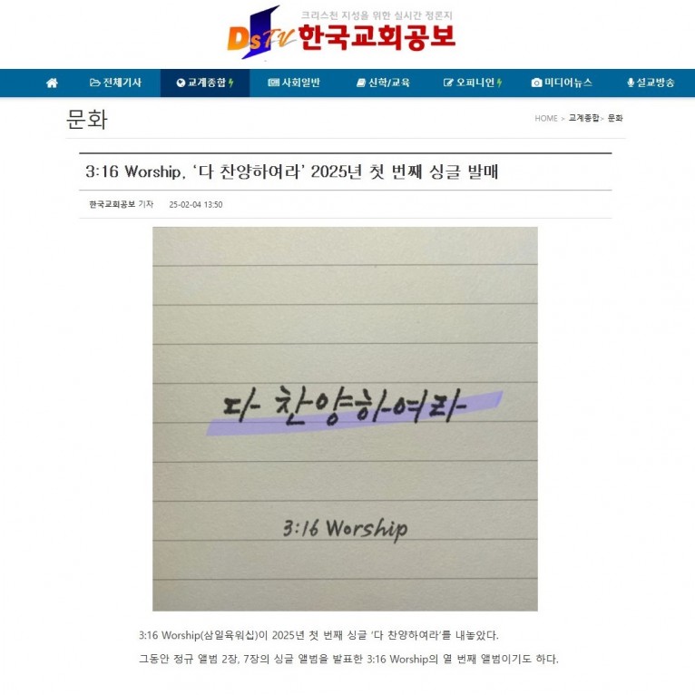 [기사] 3:16 Worship, ‘다 찬양하여라’ 2025년 첫 번째 싱글 발매(한국교회공보)