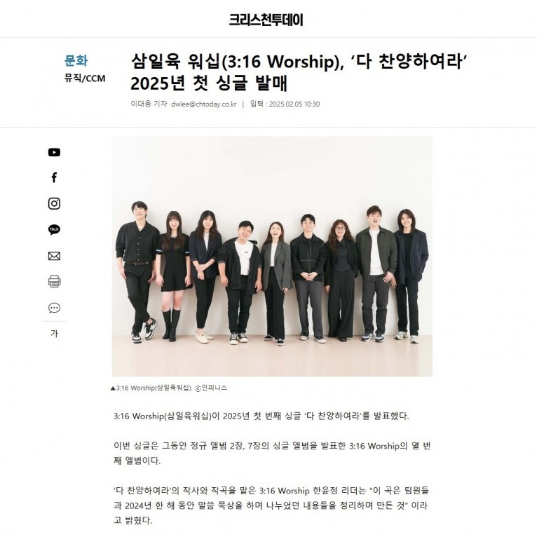 뮤직타임 [기사] 삼일육 워십(3:16 Worship), ‘다 찬양하여라’ 2025년 첫 싱글 발매(크리스천투데이)