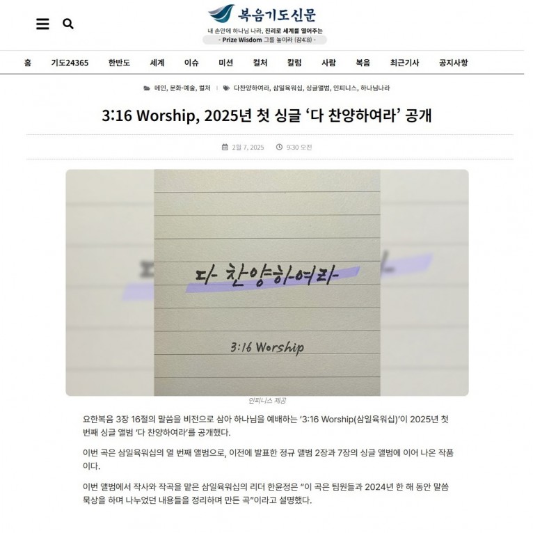 [기사] 3:16 Worship, 2025년 첫 싱글 ‘다 찬양하여라’ 공개(복음기도신문)