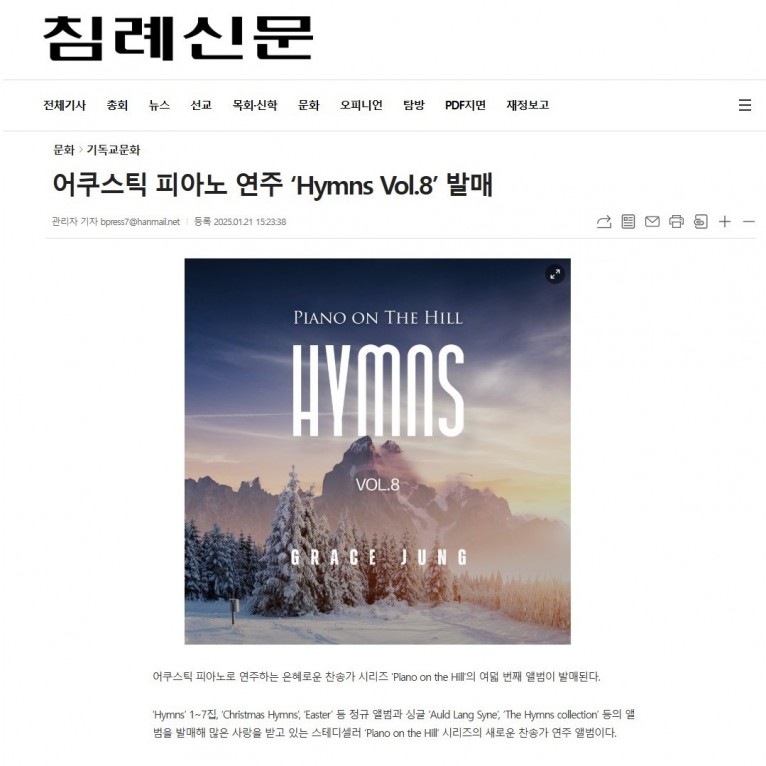 뮤직타임 [기사] 어쿠스틱 피아노 연주 ‘Hymns Vol.8’ 발매(침례신문)