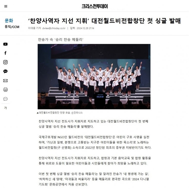 [기사] ‘찬양사역자 지선 지휘’ 대전월드비전합창단 첫 싱글 발매(크리스천투데이)
