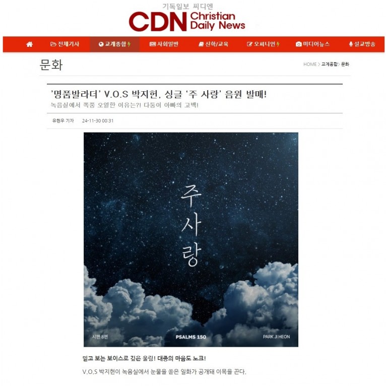 [기사] ’명품발라더’ V.O.S 박지헌, 싱글 ‘주 사랑’ 음원 발매!(기독일보 씨디엔)