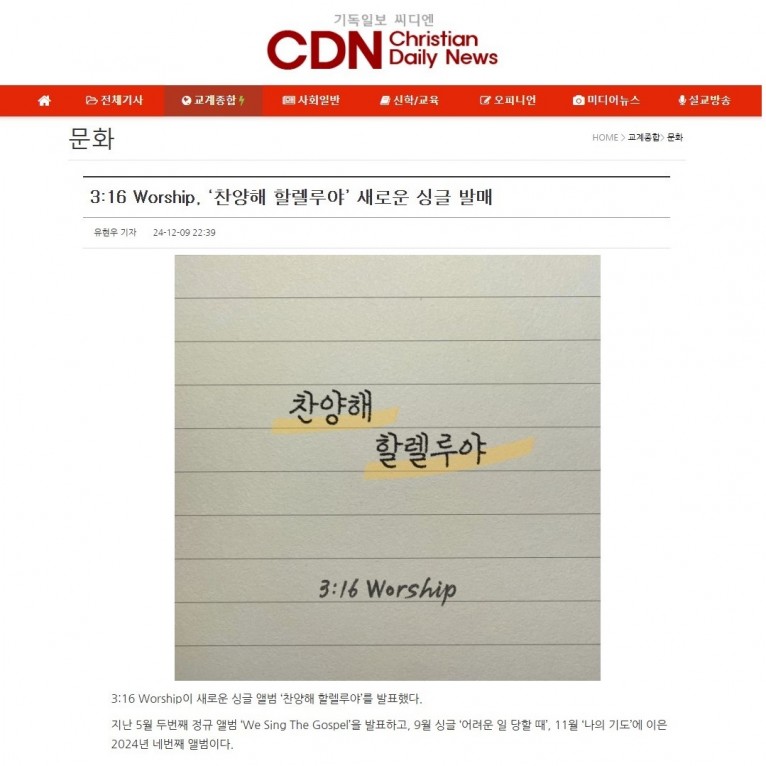 [기사] 3:16 Worship, ‘찬양해 할렐루야’ 새로운 싱글 발매(기독일보 씨디엔)