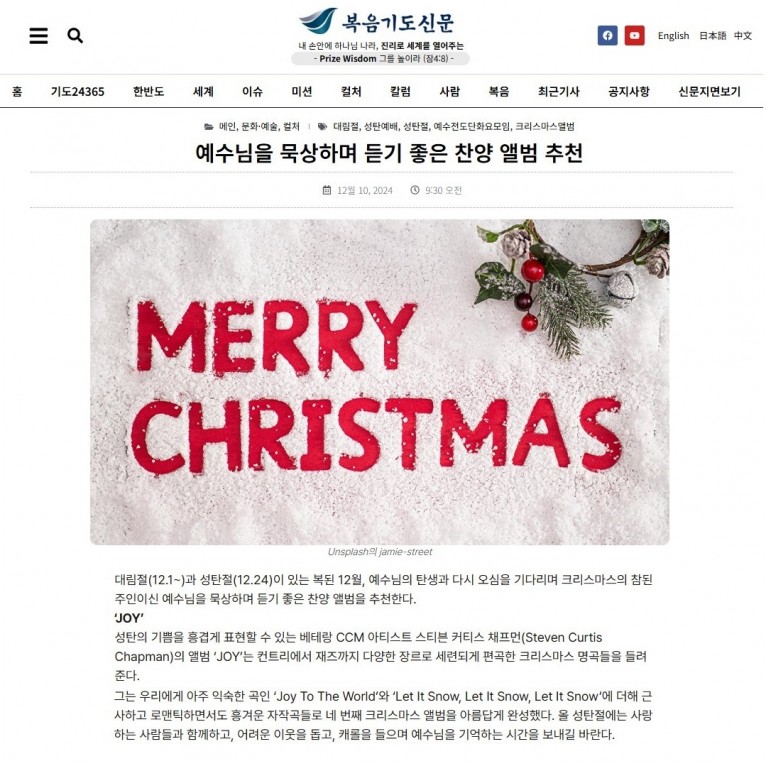 성탄의 기쁨을 흥겹게 표현할 수 있는 베테랑 CCM 아티스트 스티븐 커티스 채프먼(Steven Curtis Chapman)의 앨범 ‘JOY’는 컨트리에서 재즈까지 다양한 장르로 세련되게 편곡한 크리스마스 명곡들을 들려준다.