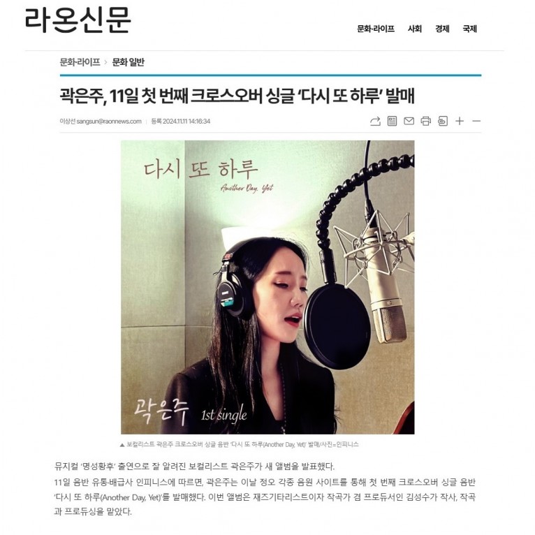 뮤직타임 [기사] 곽은주, 11일 첫 번째 크로스오버 싱글 ‘다시 또 하루’ 발매(라온신문)