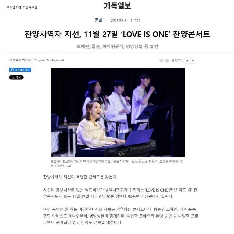 [기사] 찬양사역자 지선, 11월 27일 ‘LOVE IS ONE’ 찬양콘서트(기독일보)