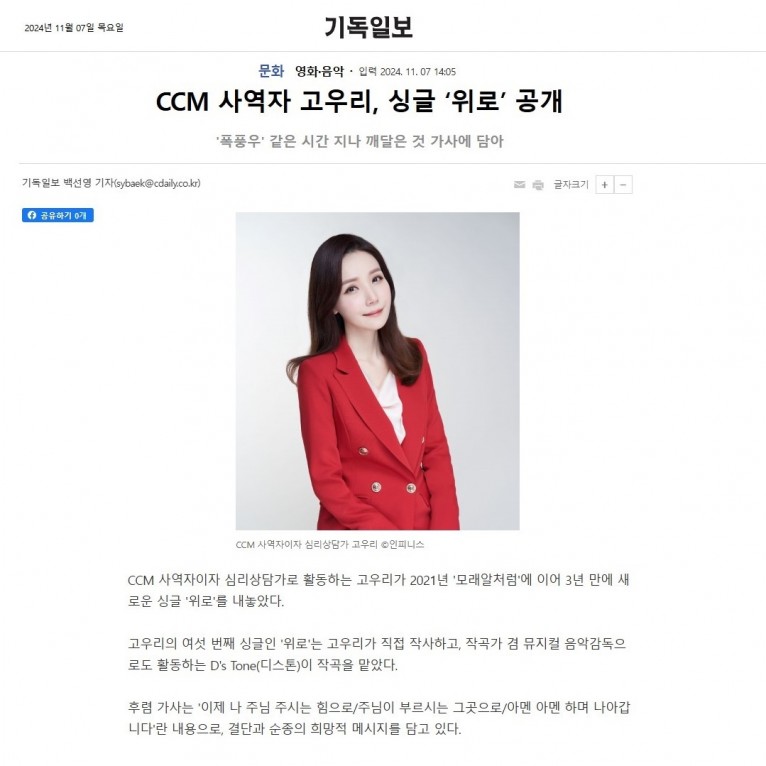 [기사] CCM 사역자 고우리, 싱글 ‘위로’ 공개(기독일보)