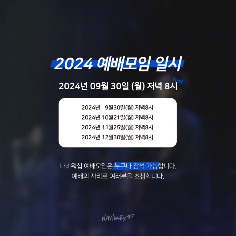 9월 30일, 월요일 저녁 8시에 첫 모임을 가지게 되며, 하반기 전체 모임 일정도 함께 공개했다. 또한 정기모임 시작과 더불어 싱어, 건반 등 예배를 섬길 동역자도 모집한다고 밝혔다.