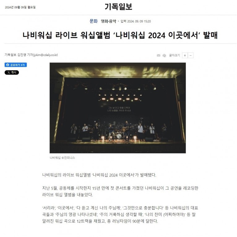 [기사] 나비워십 라이브 워십앨범 ‘나비워십 2024 이곳에서’ 발매(기독일보)