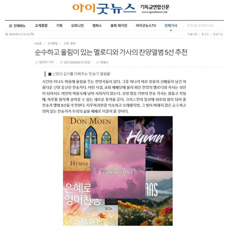 뮤직타임 [기획기사] 순수하고 울림이 있는 멜로디와 가사의 찬양앨범 5선 추천(아이굿뉴스 기독교연합신문)