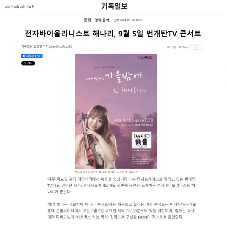 [기사] 전자바이올리니스트 해나리, 9월 5일 번개탄TV 콘서트(기독일보)