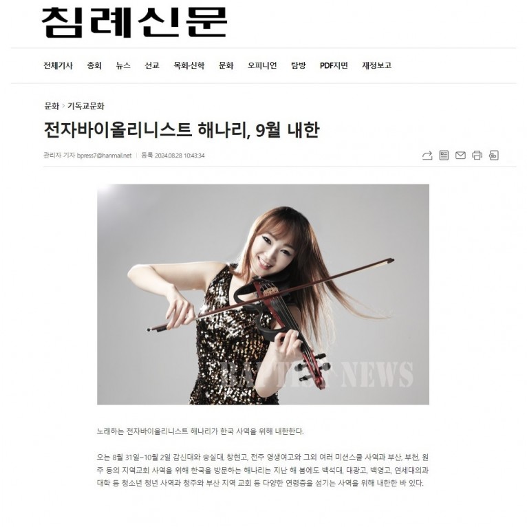 [기사] 전자바이올리니스트 해나리, 9월 내한(침례신문)