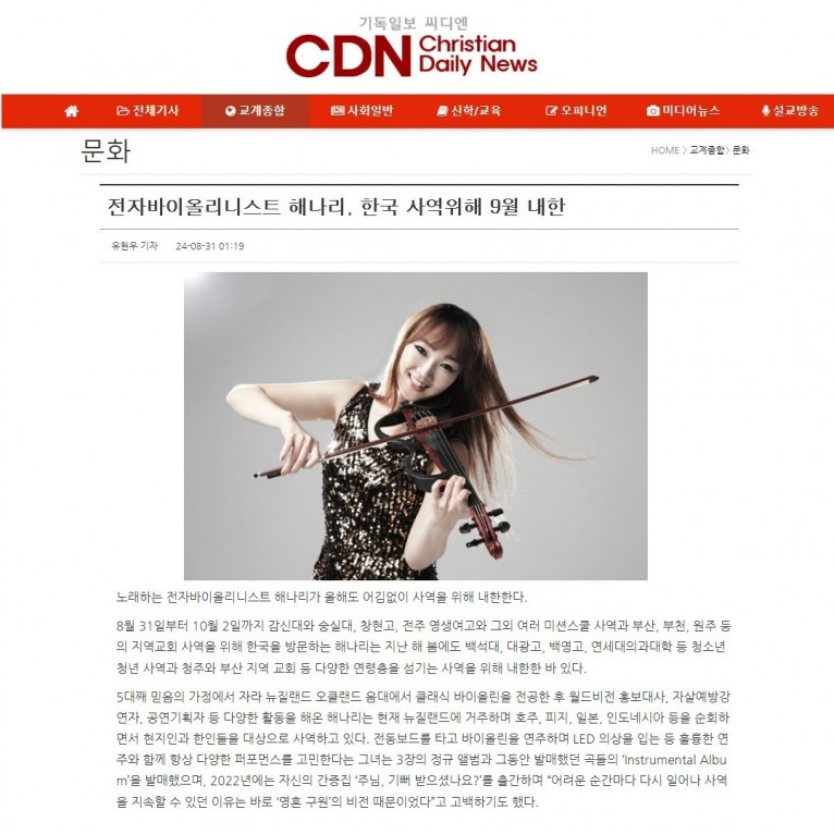 [기사] 전자바이올리니스트 해나리, 한국 사역위해 9월 내한(기독일보 씨디엔)