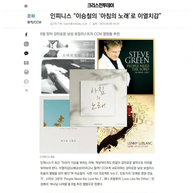 인피니스가 최근 “더위가 기승을 부리는 이때, 역설적이게도 한없이 감미로운 음악으로 더위를 잊어보려 한다. 이열치감(以熱治甘)이라고나 할까? CCM계 내로라하는 감미로운 남성 보컬리스트들의 앨범을 모아 봤다”며 이승철의 ‘시편 150 프로젝트 Vol.3’, 민호기의 ‘오래된 영원 찬송가’, 스티브 그린의 ‘People Need the Lord No.1’, 레니 르블랑의 ‘Love Like No Other’, 안성애의 ‘하나님 나라를’을 8월 추천 앨범으로 정했다.