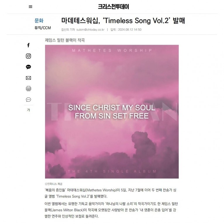 ‘복음의 증인들’ 마데테스워십(Mathetes Worship)이 5일, 지난 7월에 이어 두 번째 찬송가 싱글 앨범 ‘Timeless Song Vol.2’를 발매했다.