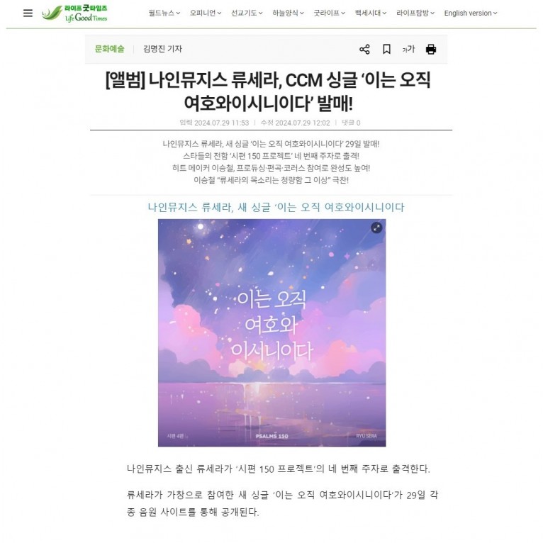 [기사] 나인뮤지스 류세라, CCM 싱글 ‘이는 오직 여호와이시니이다’ 발매!(라이프굿타임즈)