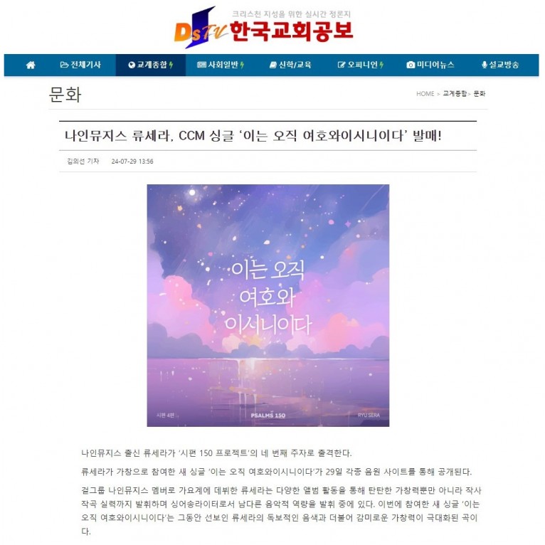 [기사] 나인뮤지스 류세라, CCM 싱글 ‘이는 오직 여호와이시니이다’ 발매!(한국교회공보)