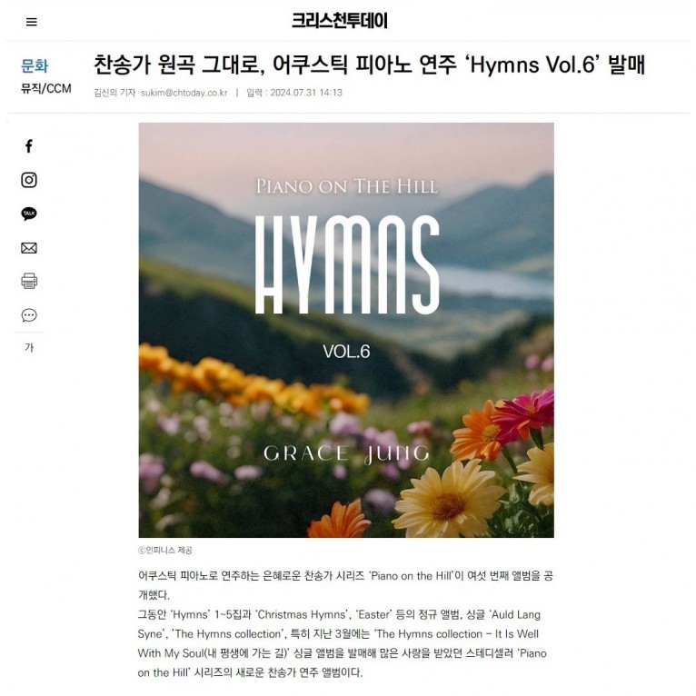 뮤직타임 [기사] 찬송가 원곡 그대로, 어쿠스틱 피아노 연주 ‘Hymns Vol.6’ 발매(크리스천투데이)