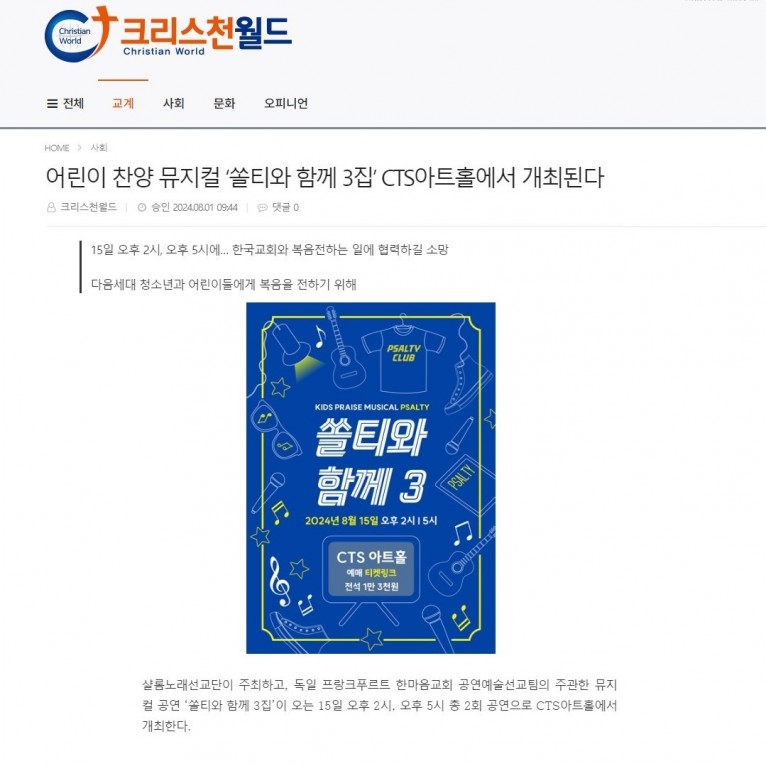 뮤직타임 [기사] 어린이 찬양 뮤지컬 ‘쏠티와 함께 3집’ CTS아트홀에서 개최된다(크리스천월드)