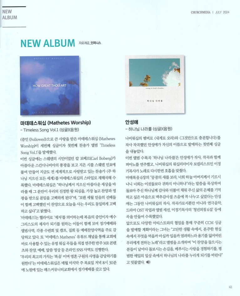 뮤직타임 [잡지] New Album_ 안성애 - 하나님 나라를 (싱글) 등 2편(월간 Church Media 2024.7월호)