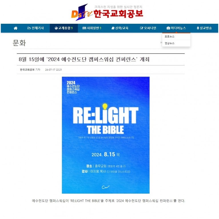 [기사] 8월 15일에 '2024 예수전도단 캠퍼스워십 컨퍼런스' 개최(한국교회공보)