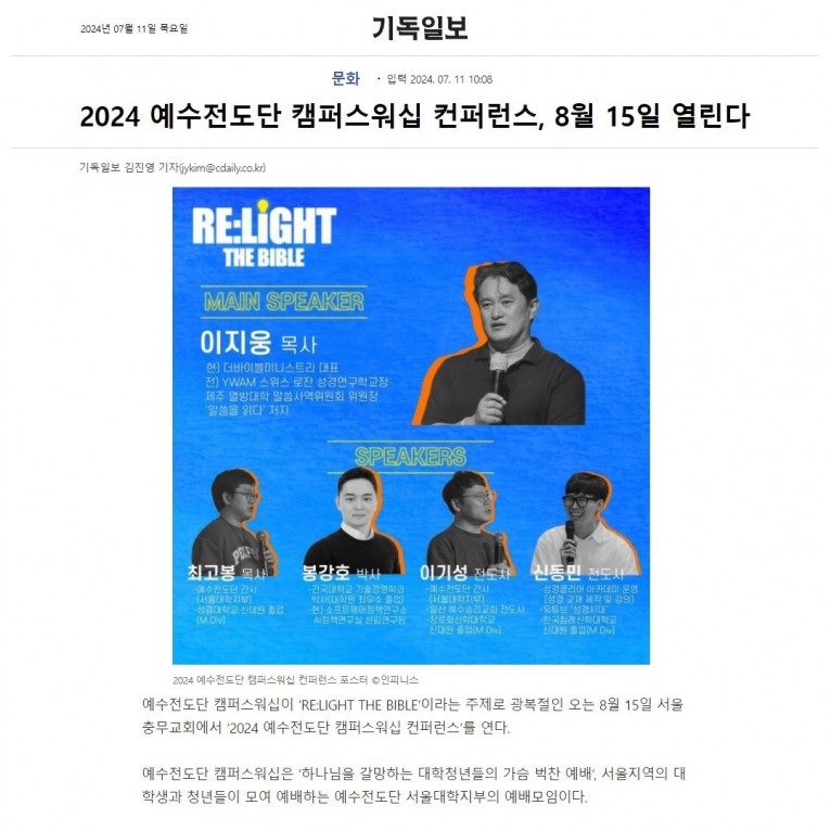 [기사] 2024 예수전도단 캠퍼스워십 컨퍼런스, 8월 15일 열린다(기독일보)