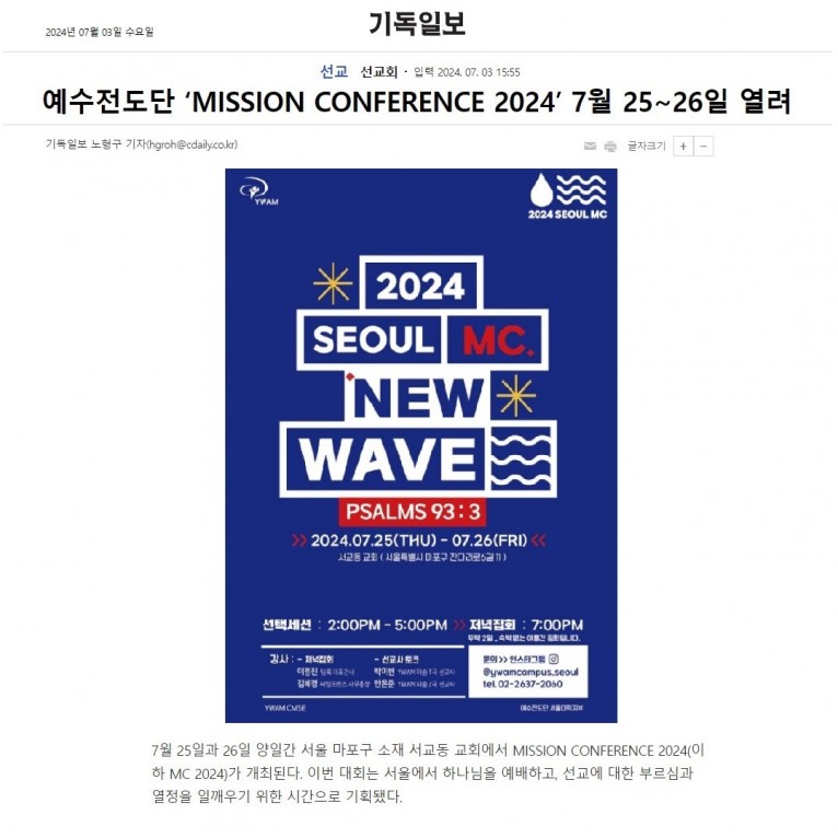 뮤직타임 [기사] 예수전도단 'MISSION CONFERENCE 2024' 7월 25~26일 열려(기독일보)