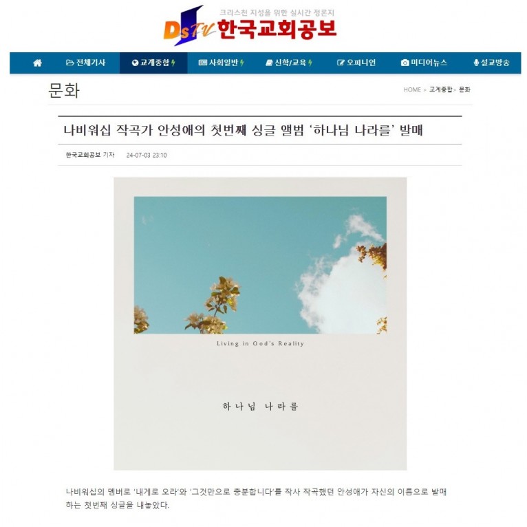 [기사] 나비워십 작곡가 안성애의 첫번째 싱글 앨범 ‘하나님 나라를’ 발매(한국교회공보)
