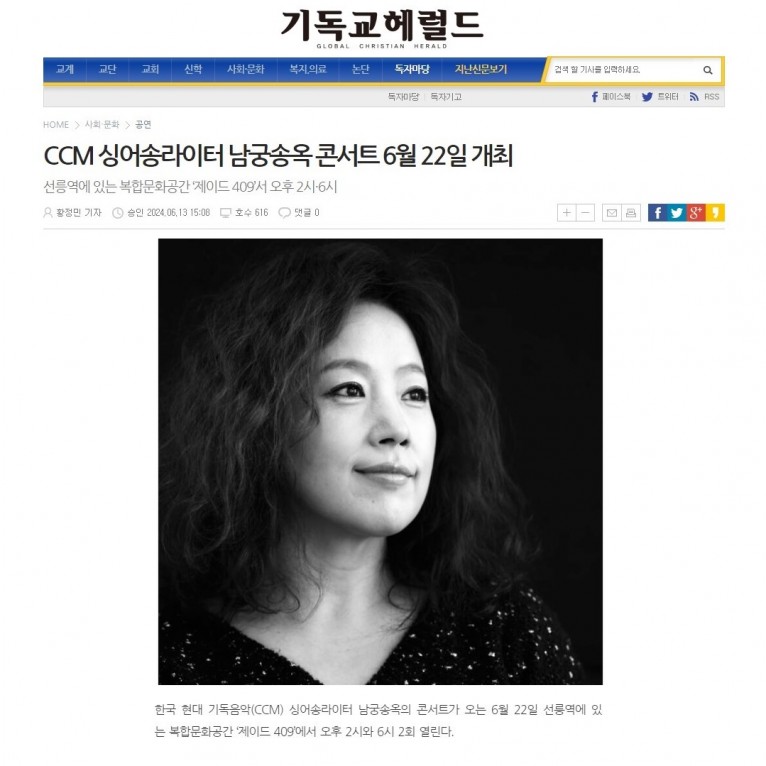 뮤직타임 [기사] CCM 싱어송라이터 남궁송옥 콘서트 6월 22일 개최(기독교헤럴드)