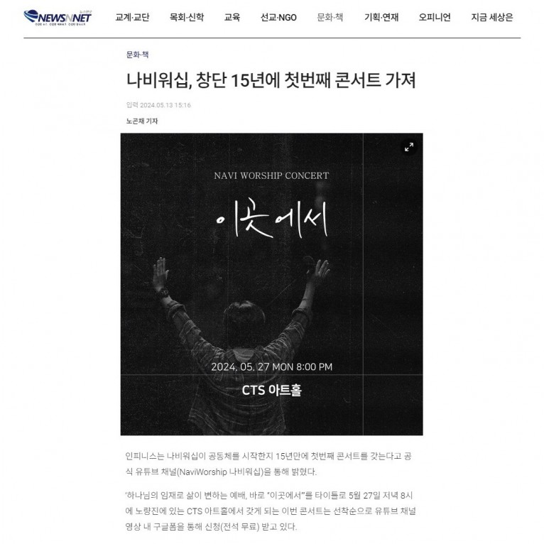 인피니스는 나비워십이 공동체를 시작한지 15년만에 첫번째 콘서트를 갖는다고 공식 유튜브 채널(NaviWorship 나비워십)을 통해 밝혔다.