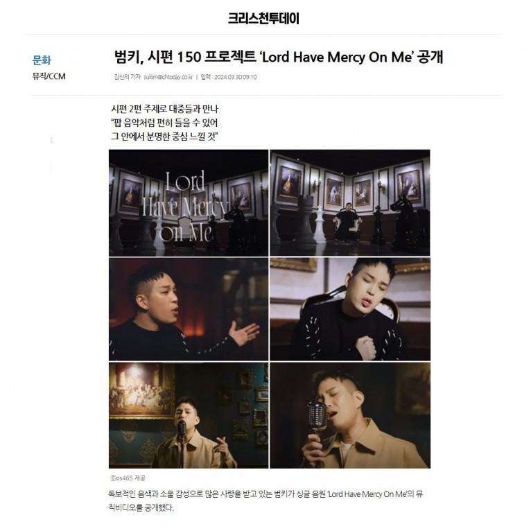 [기사] 범키, 시편 150 프로젝트 ‘Lord Have Mercy On Me’ 공개(크리스천투데이)