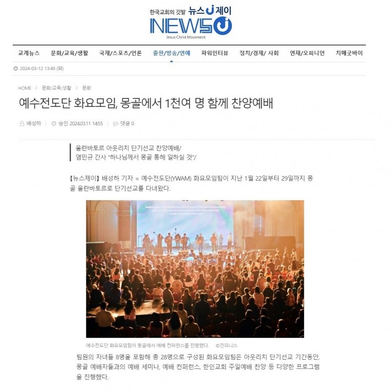 뮤직타임 [기사_인터뷰] 예수전도단 화요모임, 몽골에서 1천여 명 함께 찬양예배(뉴스제이)